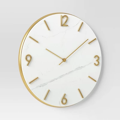 Introduce a modern, minimal timepiece to your space with the 26″ Faux Marble Finished in Polished Brass Wall Clock in White from Threshold™. This analog clock features a classic round shape with a sleek white clock face. Perfect for enhancing the decor of a home or office, this clock combines functionality with a chic design. Crafted to seamlessly blend into modern interiors, this clock will surely uplift your interiors.